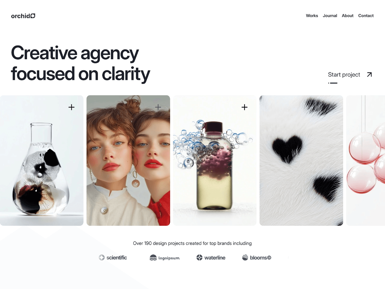 Orchid is one I built myself, and it's probably the template I'm most proud of so far. It's designed for creative agencies, studios, and independent designers who want something that feels light and personal without sacrificing professionalism. The layout is bright and minimal, the transitions are smooth, and everything — Works, Journal, Legal — is CMS-powered so you're not rebuilding pages every time something changes.