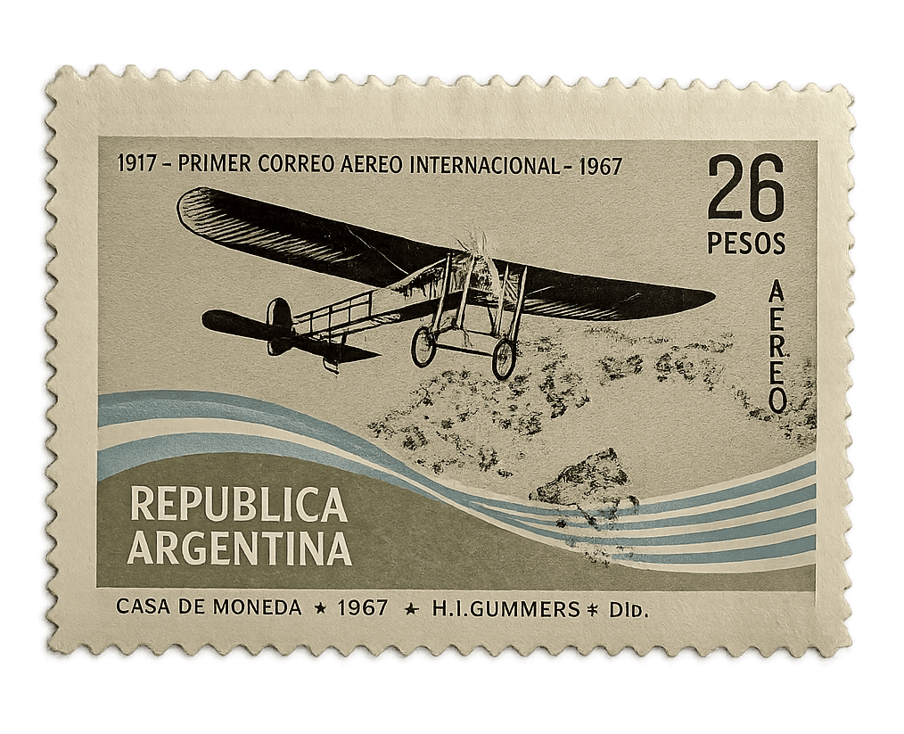 A horizontal 1967 Argentine airmail stamp featuring a vintage biplane engraving in a muted, tri-tone mid-century color scheme.