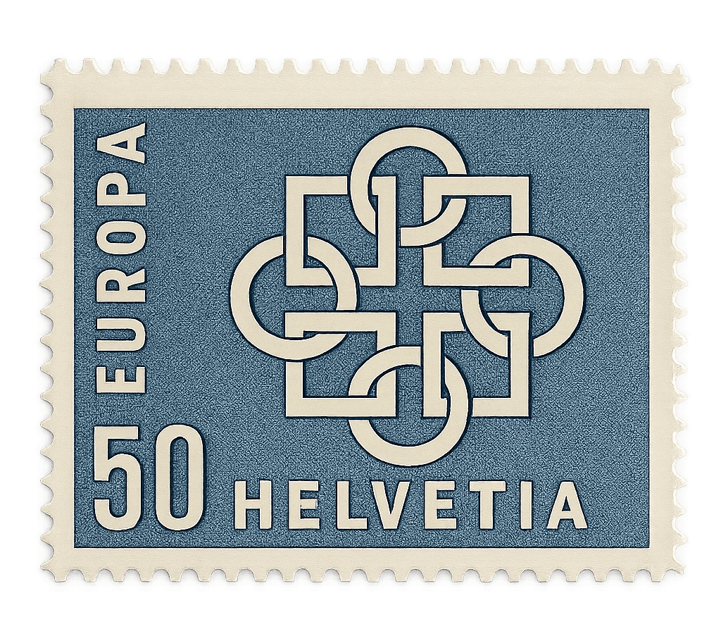 A minimalist steel-blue stamp featuring the 1964 CEPT interlocking squares and circles logo, representing European integration.