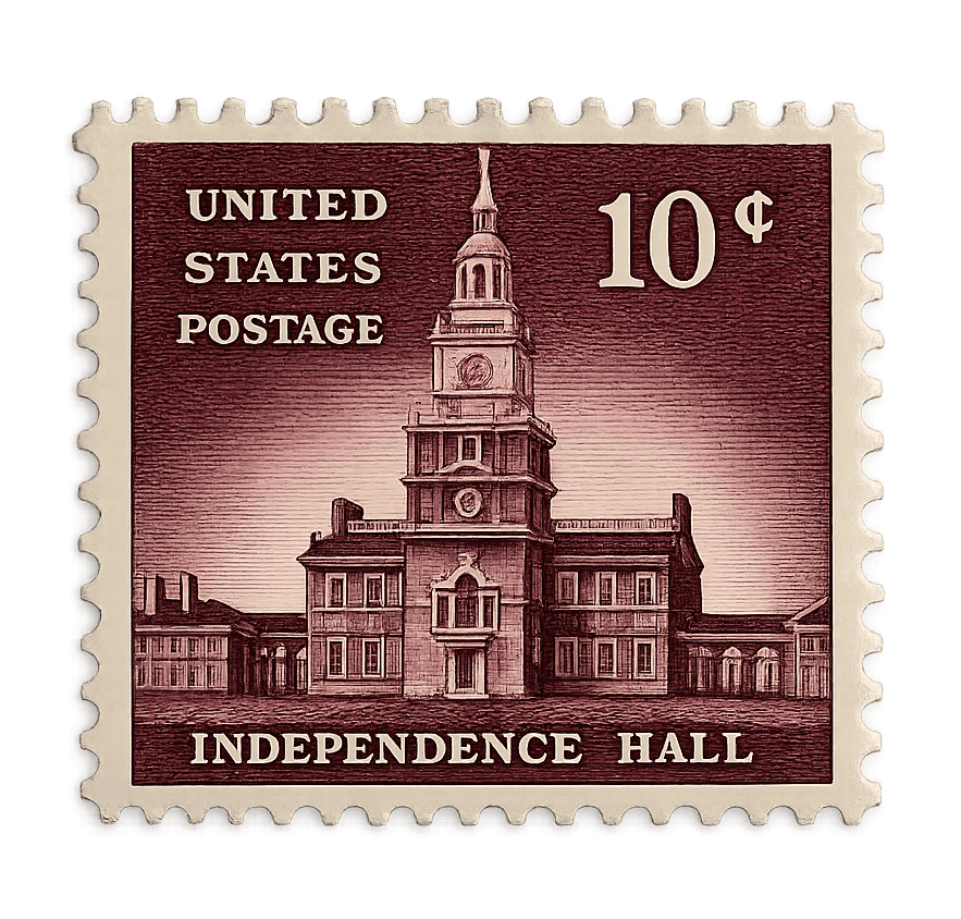 A detailed, monochromatic 1970s U.S. postage stamp featuring an engraved architectural study of Philadelphia's Independence Hall in deep maroon.