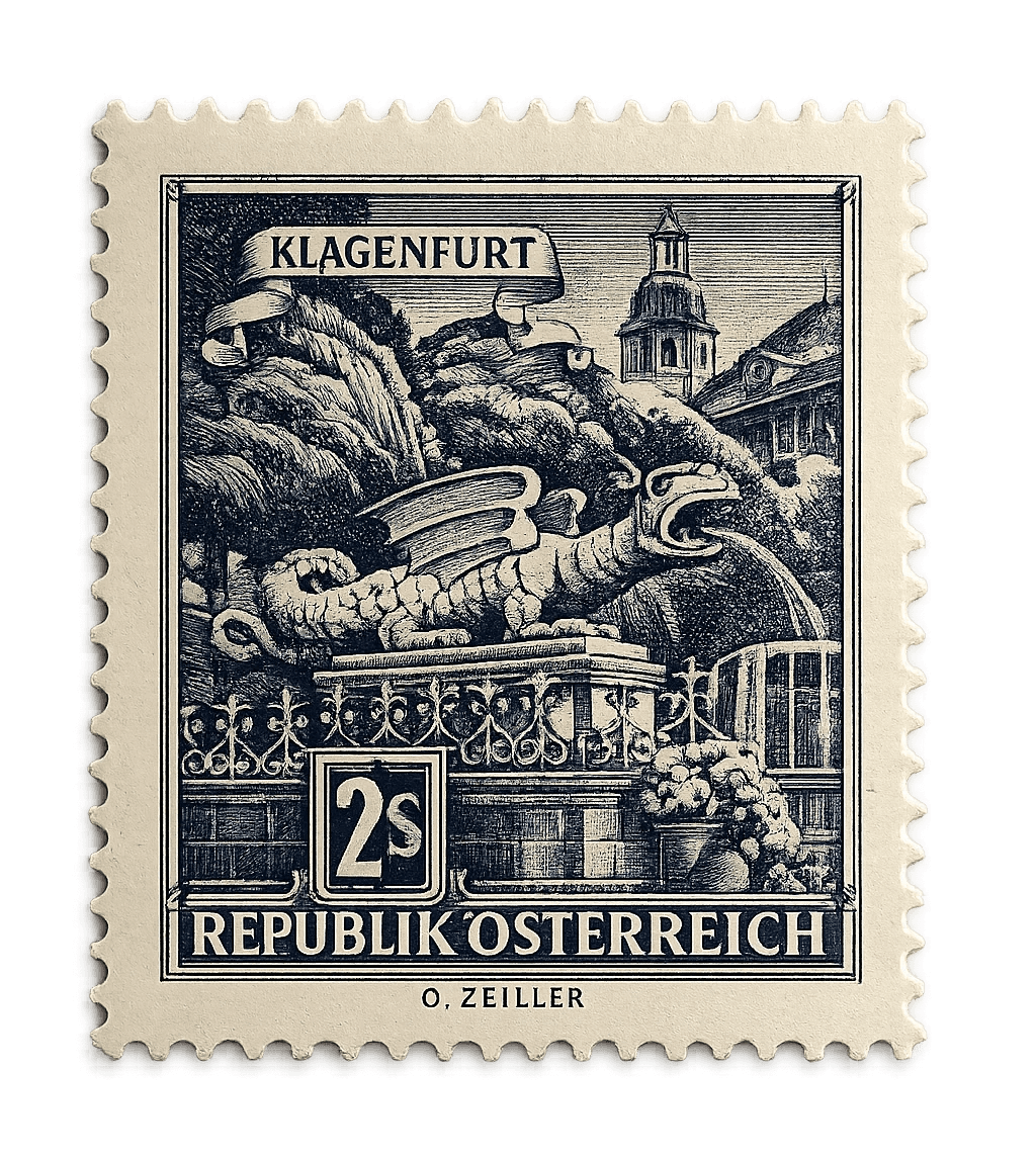 A stunning monochromatic dark blue engraved stamp depicting the legendary Lindwurm dragon statue of Klagenfurt against a detailed city backdrop.