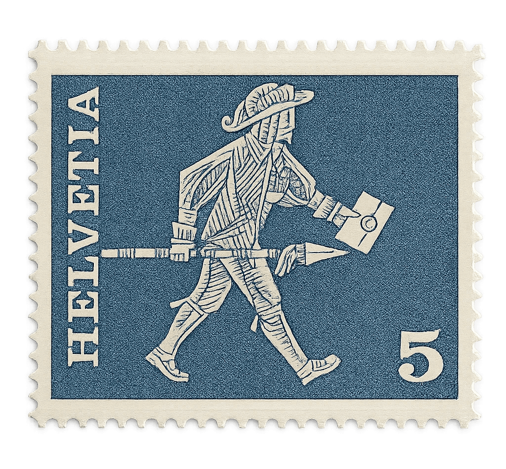 A monochromatic steel-blue stamp featuring a stylized engraving of a medieval courier carrying a letter and a halberd, representing early Swiss communication history.