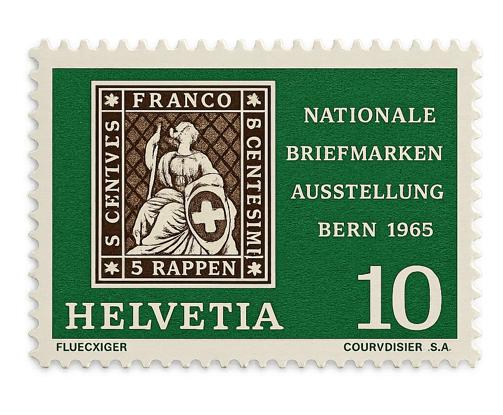 A forest-green commemorative stamp featuring a reproduction of a classic "Sitting Helvetia" definitive, issued for the 1965 National Stamp Exhibition in Bern.