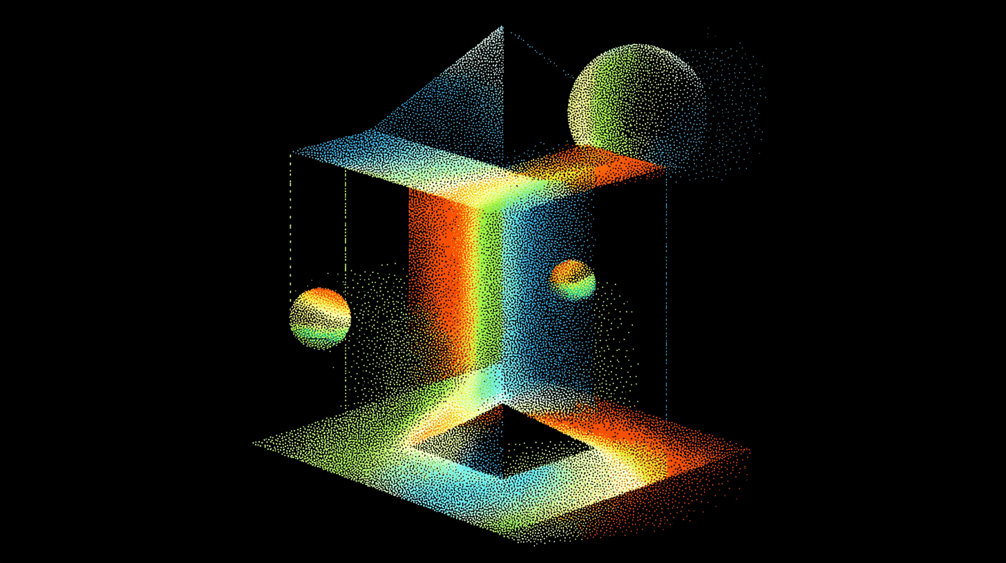 An abstract isometric AI illustration using a stippled texture to show light dispersing through a geometric structure against a black void.
