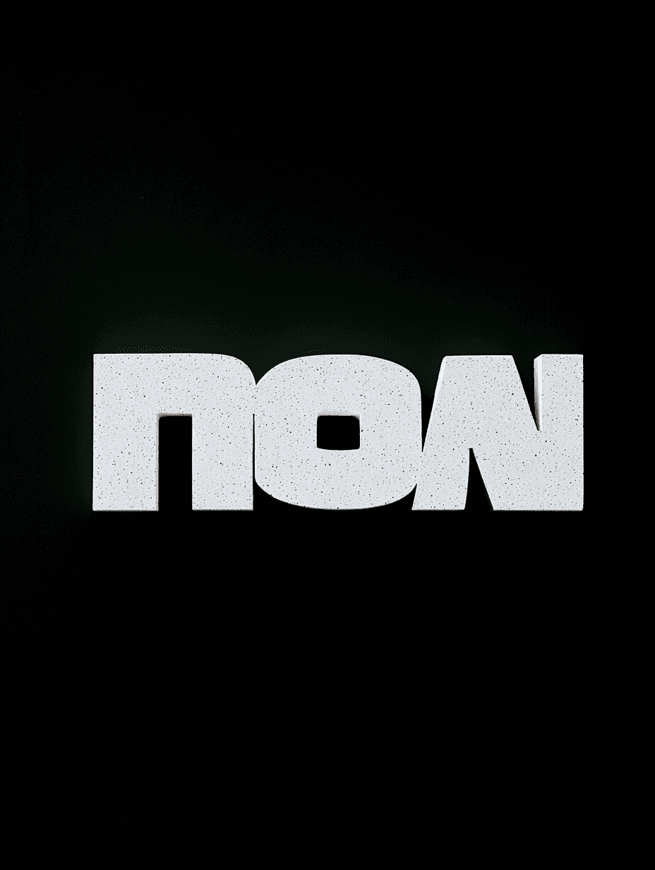 A minimalist, AI-generated image featuring the word "NON" rendered in a heavy, extra-bold sans-serif typeface. The letters have a white, granular texture resembling stone or cast concrete and are set against a solid black background, creating a stark, sculptural effect.