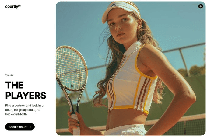 A landing page concept for a tennis matchmaking app, featuring warm lifestyle photography and a clean, asymmetrical layout.