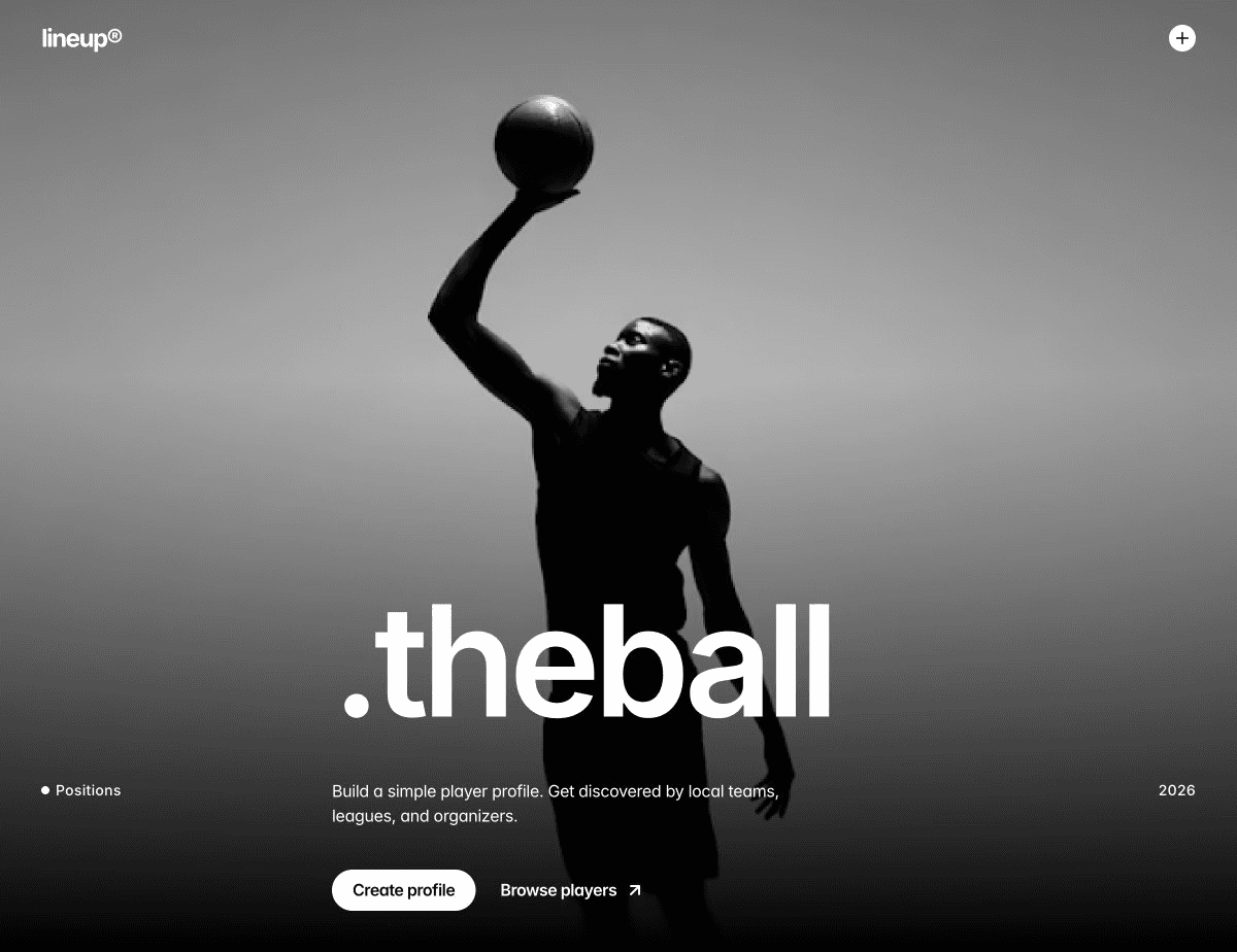 A minimalist landing page hero for a sports scouting platform, featuring a dramatic low-key silhouette of a basketball player and bold, lower-case typography.