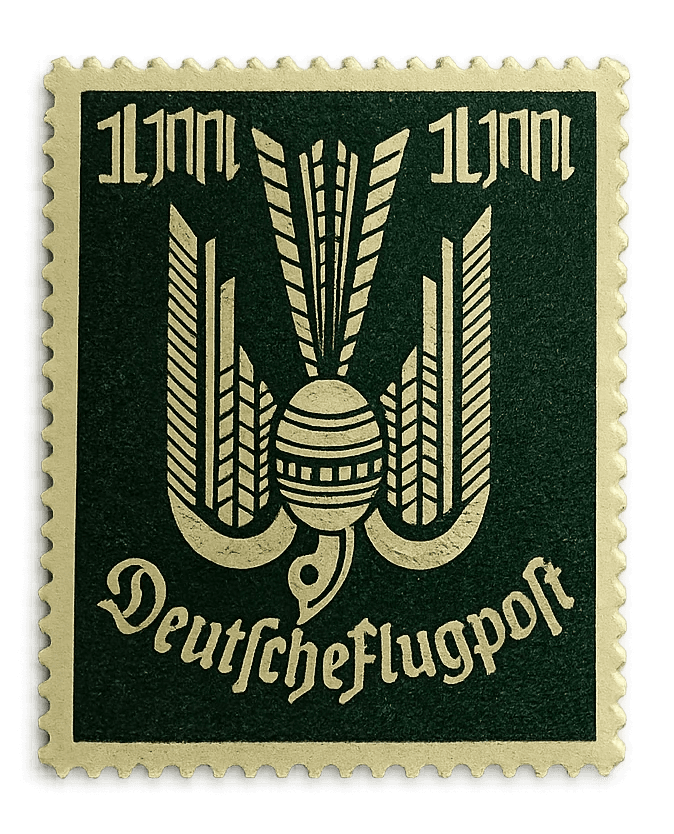 A graphic 1920s German airmail stamp featuring a stylized winged post horn emblem in a monochromatic deep green and cream palette.