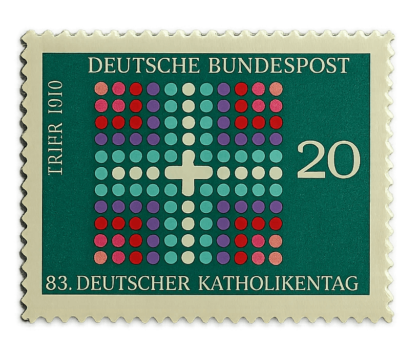 A vibrant 1970 West German postage stamp featuring a geometric grid of multi-colored dots forming a cross, set against a deep forest-green background.