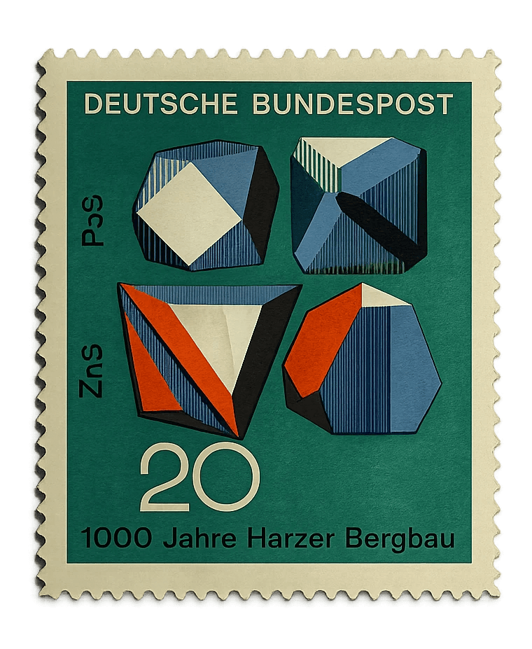 A geometric 1968 West German postage stamp featuring stylized crystal structures and chemical symbols representing the mining heritage of the Harz region.