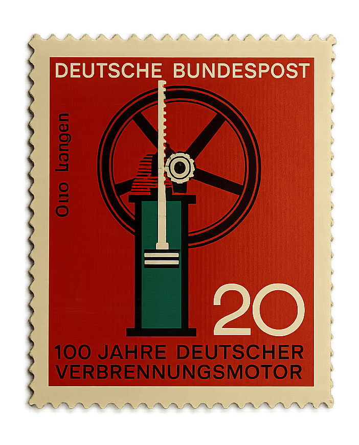 A 1967 West German postage stamp featuring a stylized, high-contrast schematic of the first atmospheric gas engine against a bold red field.