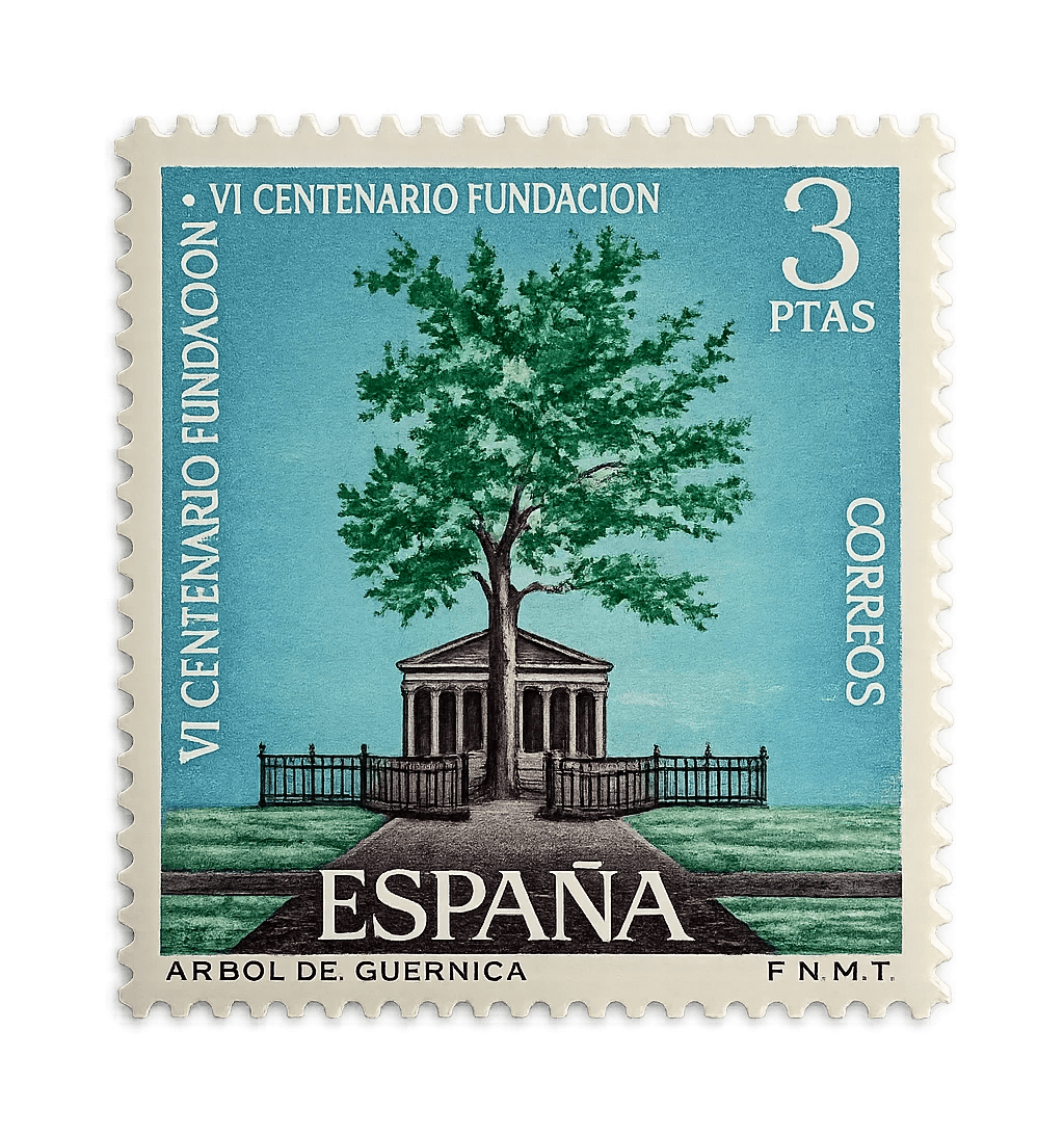 A vibrant, illustrative stamp depicting the historic Tree of Guernica and the Assembly House against a bright blue sky, part of the VI Centenary series.