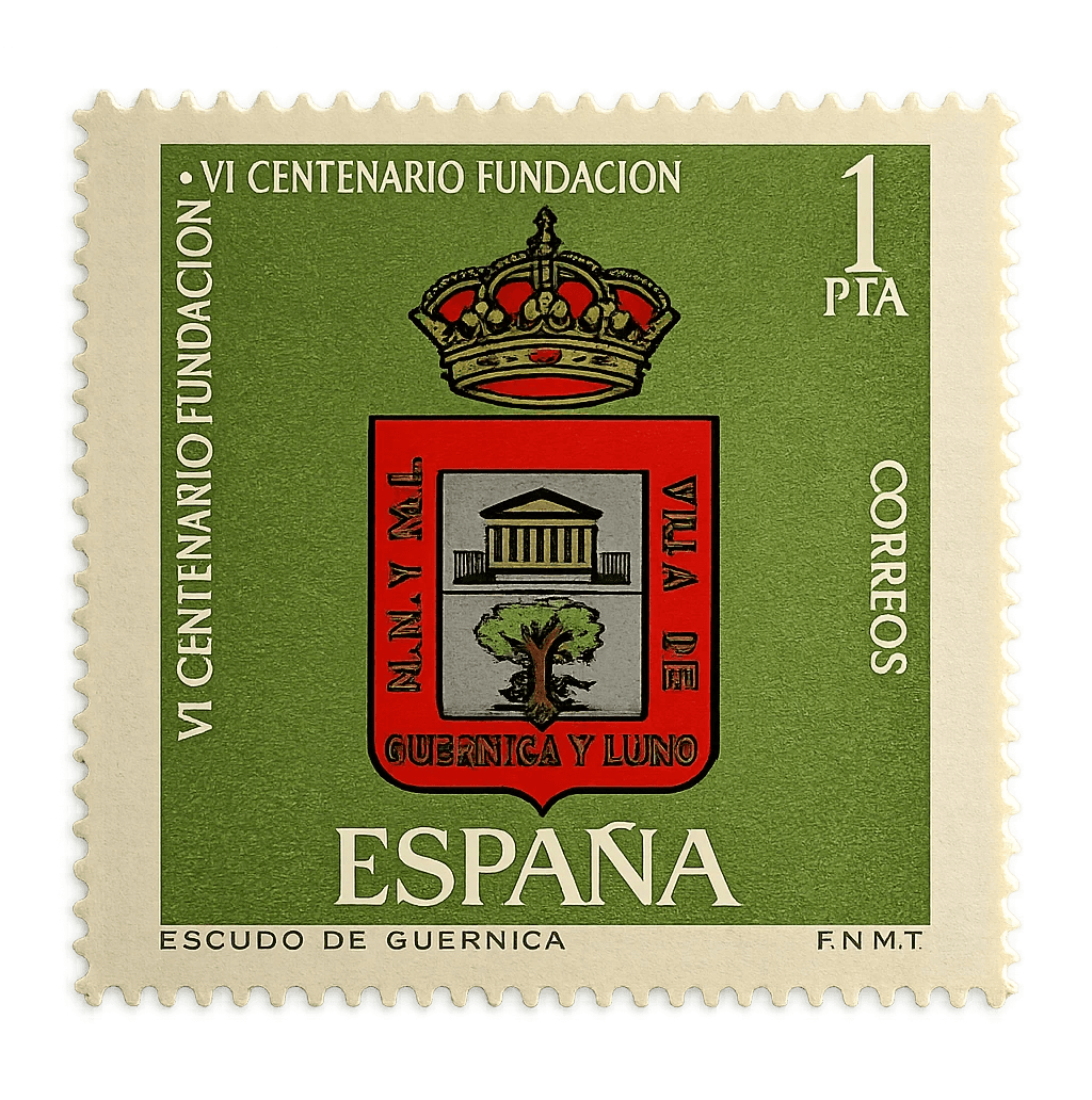 A textured olive green stamp featuring the crowned coat of arms of Guernica, commemorating the 600th anniversary of its foundation.