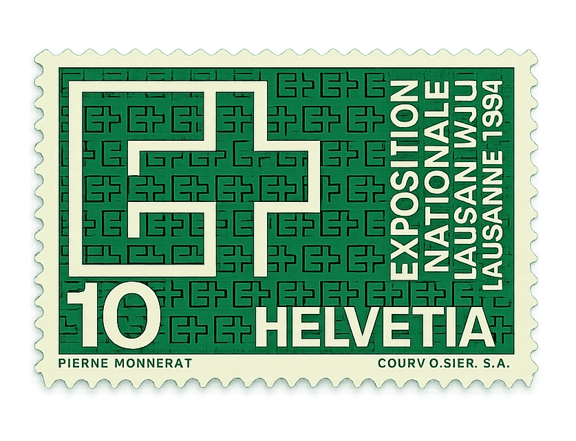 A geometric 1994 Swiss postage stamp designed by Pierre Monnerat, featuring a repeating icon pattern and bold modernist typography.