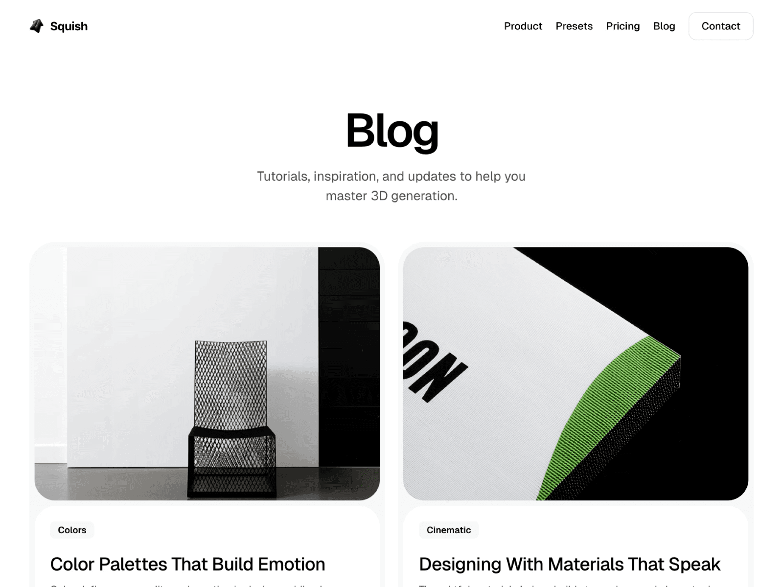 A minimalist blog section for the Squish Framer template, featuring a spacious grid, high-contrast imagery, and refined typographic hierarchy for a premium reading experience.