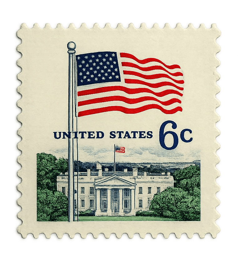A patriotic 1968 U.S. postage stamp featuring a detailed engraving of the White House topped by a prominent, flowing American flag.